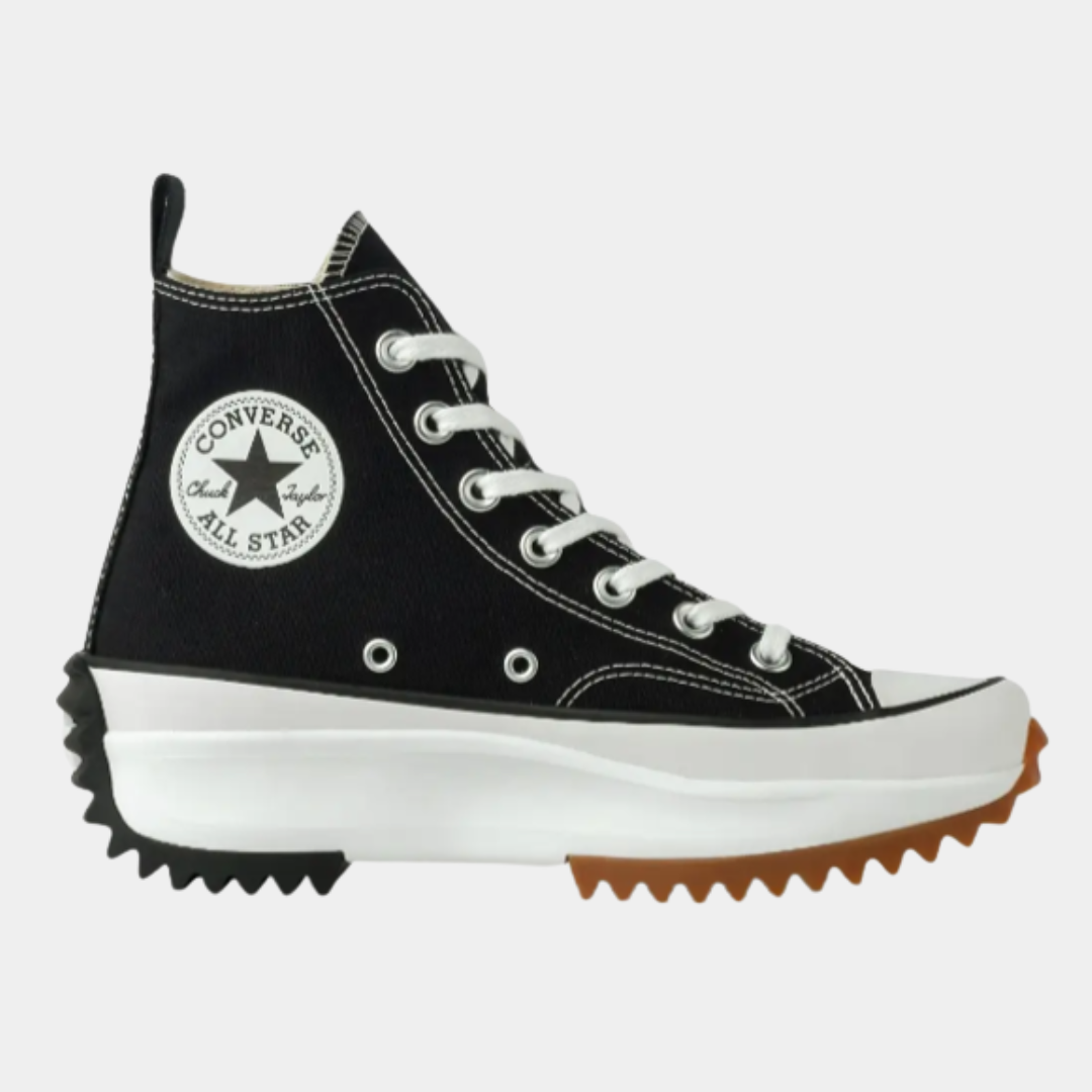 | Design | O design clássico inclui uma silhueta de cano alto, mas também existem versões de cano baixo. O modelo apresenta a característica estrela da Converse na lateral, além de ilhós de metal para os cadarços. |